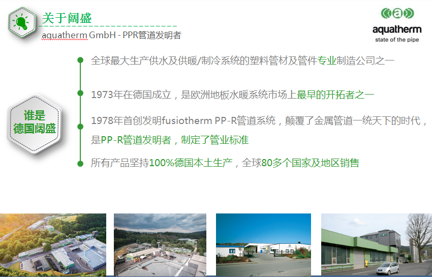德國闊盛是充滿活力的跨國公司,主要生產(chǎn)用于供水和供熱/制冷系統(tǒng)的塑料管材及配件。該公司成立于1973年,成立之初主要從事地板輻射采暖系統(tǒng)的開發(fā)、生產(chǎn)及安裝,距今已有40余年管道生產(chǎn)經(jīng)驗。
