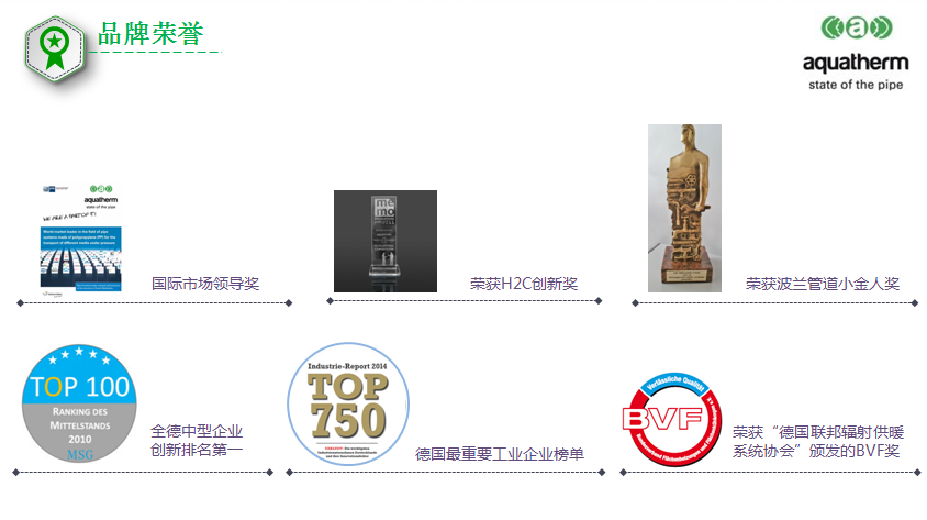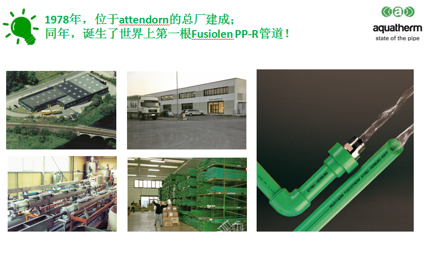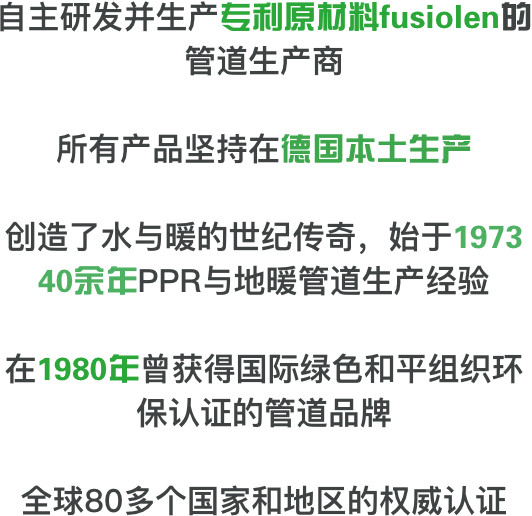 1978年,研發(fā)出fusiolen PP-R管道系統(tǒng),通過特殊工藝生產(chǎn)出全塑料管材及管件。此項發(fā)明顛覆了金屬管道一統(tǒng)天下的時代,為給水管道更安全,更健康,更環(huán)保的目標做出了杰出貢獻!所以公司被授予 綠色環(huán)保組織的獎項。