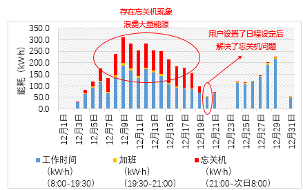 根據(jù)用戶的反饋,其中21:00-次日8:00是忘關(guān)機(jī)時(shí)間,通過VRV Intelligent系列的后臺(tái)數(shù)據(jù),該系統(tǒng)12月份在21:00-次日8:00時(shí)間段內(nèi)使用電量:1203.3kW·H