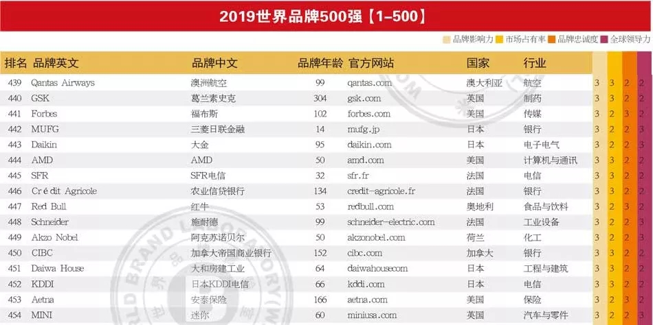 該榜單按照品牌影響力的三大關(guān)鍵指標(biāo),即市場(chǎng)占有率(Market Share)、品牌忠誠(chéng)度(Brand Loyalty)和全球領(lǐng)導(dǎo)力(Global Leadership),對(duì)全球20000個(gè)知名品牌進(jìn)行評(píng)分,最終推出世界品牌500強(qiáng)。